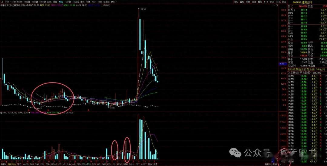 现在打开你的行情软件,切换到季k线,如图2,捷荣技术(002855)季线异动洗盘后第一个红圈就已经开始试图让价格接近,但价格重心依旧还是下移了,随后股价就一路调整。在启动那一刻季k线上出现了什么,成交量萎缩至前一个季度的一半以上,当季季k线收盘价略接近,并且自身是小k线。假设现在是一个无股不庄的年代,就算是所有股票都有庄家,谁能让一个季度的成交量突然锐减到一半以下,还是在上涨的过程中,总不能是散户吧,也不会是游资。这种大周期的成交量锐减如果在下跌过程本身倒没什么特别值得注意的,但如果是在趋势演变或转折的过程中出现并且价格还稳定在一个极小的范围内,从某个角度来说,市场的流动股票则必然减少了,你也可以说是筹码集中了,就这一点读图技巧早已包含股东户数,筹码峰、资金流向等等之类的方法和战法,因为图表(量价)是本源。如果是在异动洗盘后发生的就更加要密切注意了。至于说这个缩倍量中这些股票是主力拿走了或公司自己回购了,是大小股东的亲朋好友买入锁仓了,还是其他机构游资参与了,哪怕是被我买入了,都不重要。你只需要和市场站在一起,你就能获得市场的力量。捷荣这个量价双缩的位置也恰好是前期第一个红圈试图让价格接近的位置(关键价位),确认完关键价位后下一个季度爆发了500%,成为了年度牛股。