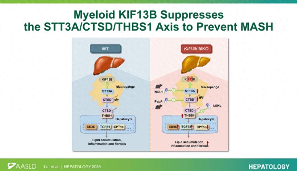 参考文献:Lu K, Shen X, Guo Z, et al. Myeloid KIF13B suppresses the STT3A/CTSD/THBS1 Axis to prevent MASH. Hepatology. Published online February 25, 2026. doi:10.1097/HEP.0000000000001726