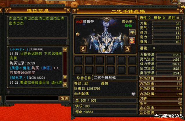 其实怀旧真的有不少超高资质的杰出珍兽。比如【太湖仙岛】服务器的这只3021的杰出千锋战蝎: