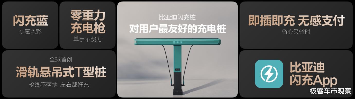 传统公共充电桩枪重、线脏、移动不灵活,充电流程还很繁琐。为了解决这些痛点,比亚迪闪充桩采用了全球首创的“滑轨悬吊式T型桩”设计,让线拉着枪,手感非常轻巧,几乎是“零重力充电枪”;并且,枪线永远保持悬空,避免缠绕更干净;还可以让用户轻松左右滑动,充电更灵活。同时,比亚迪还打通了车和桩之间的所有链路,只需通过比亚迪闪充APP简单设置,即可实现“即插即充,无感支付”,这就是对用户最友好的充电桩。