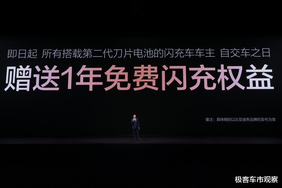 发布会现场,王传福还宣布:所有搭载第二代刀片电池的闪充车车主,均享有重磅“闪充权益”,自交车之日起,在全国闪充站可享受1年的免费闪充权益,让闪充体验更畅快。并且,在闪充免费期结束后,比亚迪闪充站也会同行业保持一致,不会额外收费。
