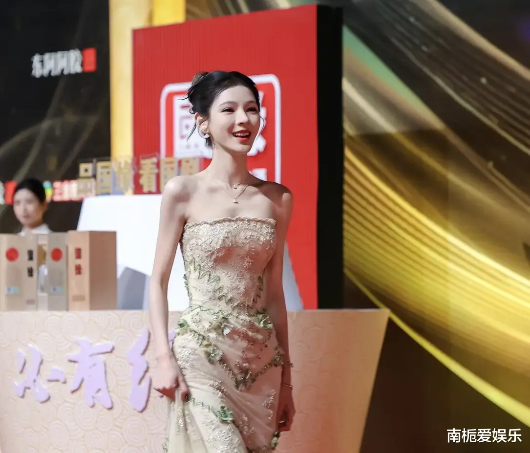2025年国剧盛典红毯上,张予曦以一袭香槟金抹胸长裙惊艳亮相,瞬间点燃全网热议。裙身密布碎钻与立体花艺刺绣,在暖光映照下如鎏金流淌。抹胸设计精准勾勒出她优越的直角肩与纤细腰线,搭配高盘发髻与耳畔轻扬的碎发,将古典贵气与灵动柔美巧妙融合。这一身造型不仅视觉冲击力十足,更因她松弛自然的仪态,被网友誉为“从古风画中走出的公主”。