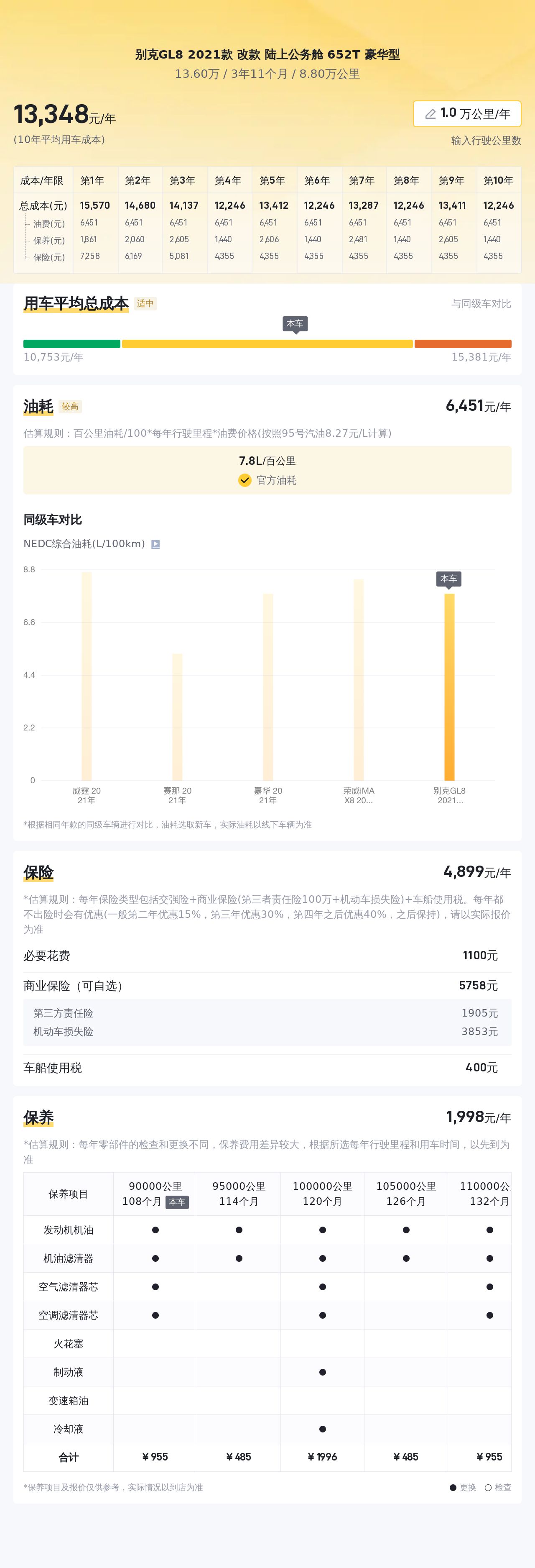 懂车帝平台数据显示,这款别克GL8 2021款 改款 陆上公务舱 652T 豪华型的10年平均用车成本约为13473元/年,具体费用与车主的用车习惯及用车强度有关。同等条件下,这台车的油耗会偏高。