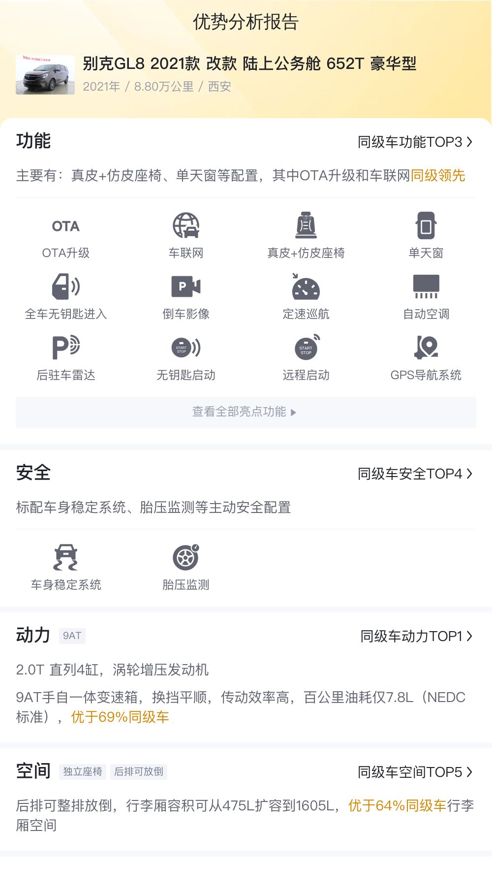 综上所述的新车含税价、用车成本、市场行情、优势分析、同款比价等数据仅供参考。在配置部分,因为二手车非标品,车辆可能会存在配置改装的情况,具体车况信息需要线下结合车辆实际情况进行综合参考。