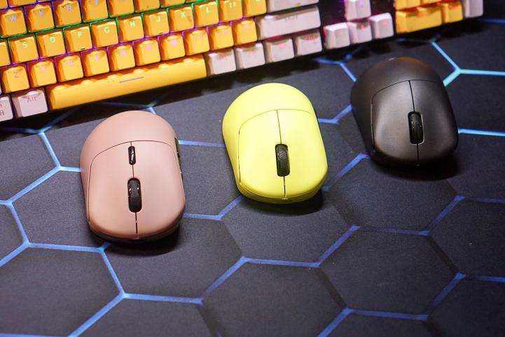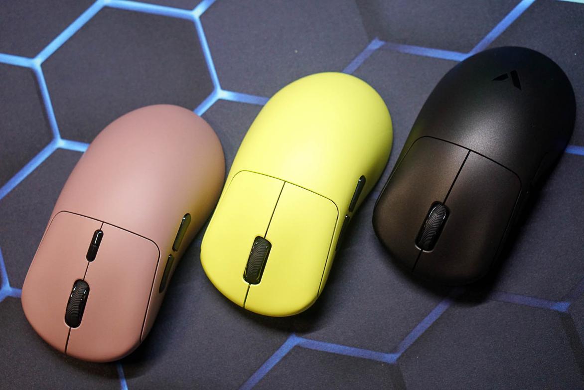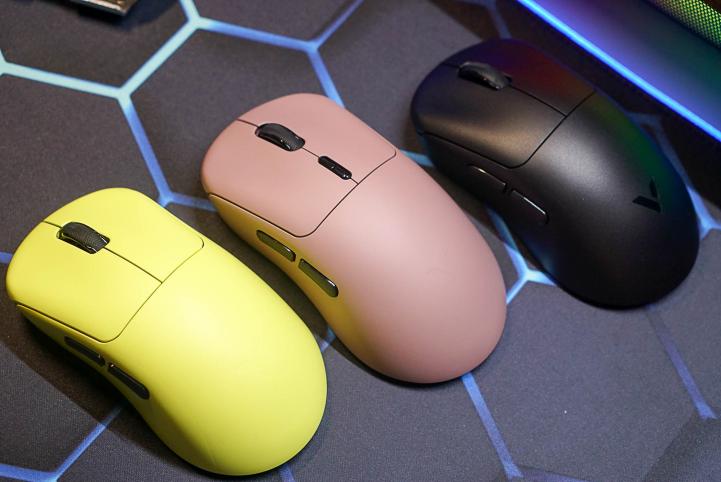 我手上的这几款鼠标分别是黑色的VT3s、炽光黄的VT3s MAX和冰莓粉的VT3,同一系列的鼠标还有胶月白、树莓粉的配色,而VT3s MAX鼠标左侧的还印刷有MAX型号的标识,通过它可以非常清晰地分辨出VT3、VT3s和VT3s MAX的型号。