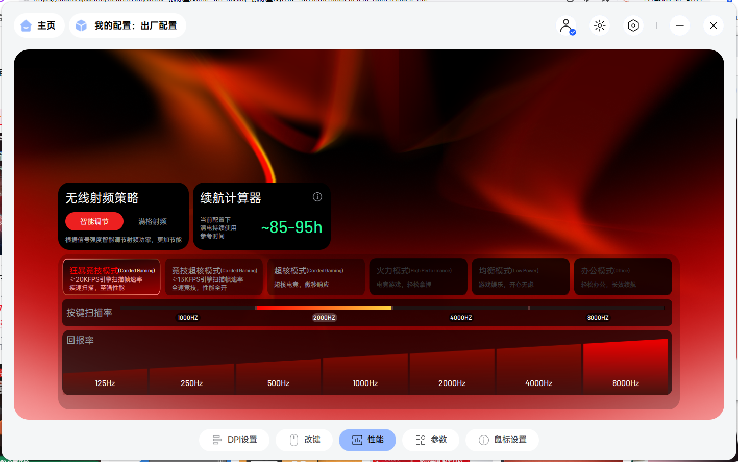 独享:4档按键扫描率,至高8K,全链路无线最快按键速度≤0.225ms,全链路有线最快按键速度≤0.155ms。