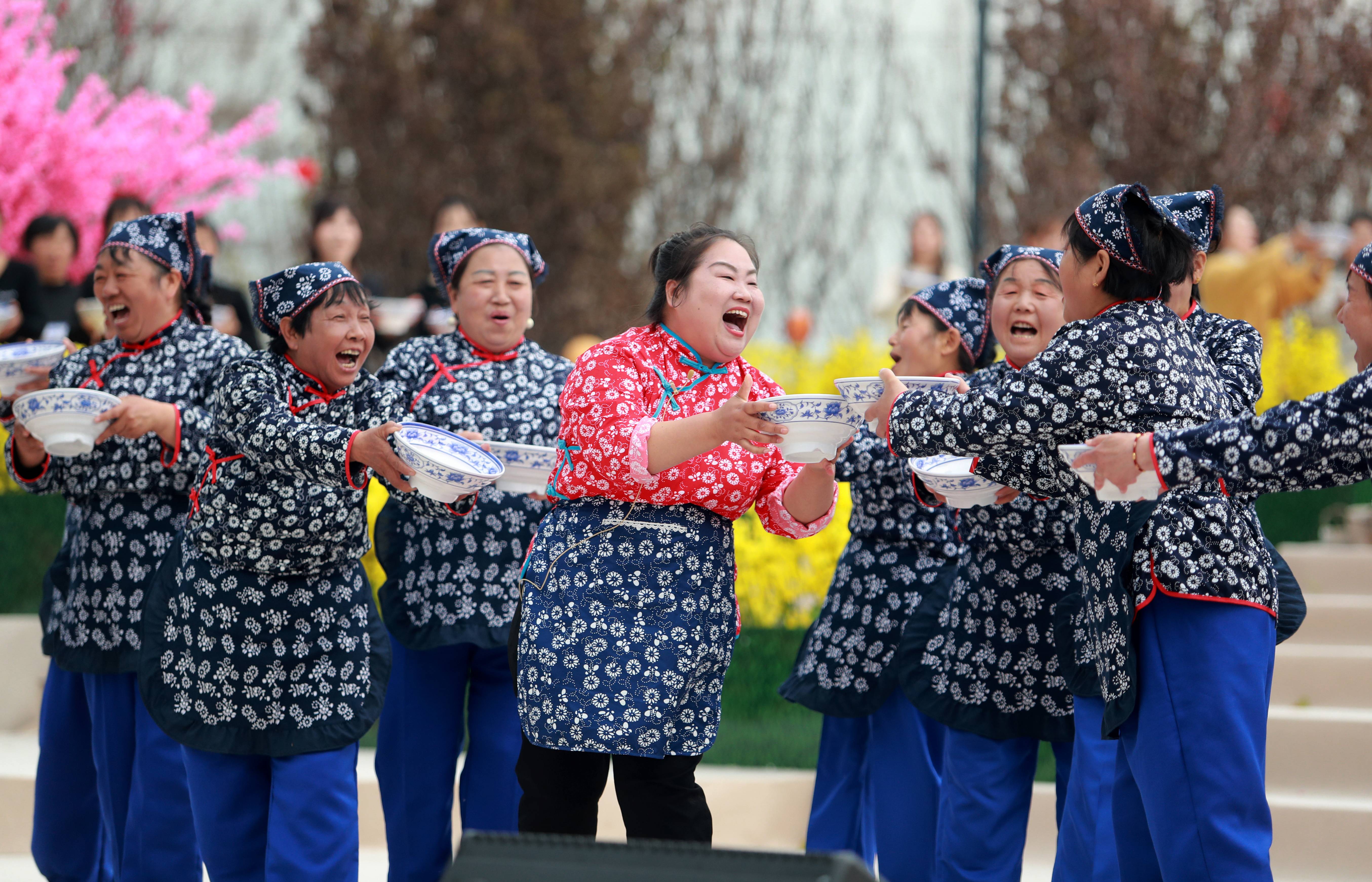 2026年3月28日,华阴市孟塬镇司家秋千园,村民演出华阴乡土特色的舞蹈说唱《辣子喝汤》。