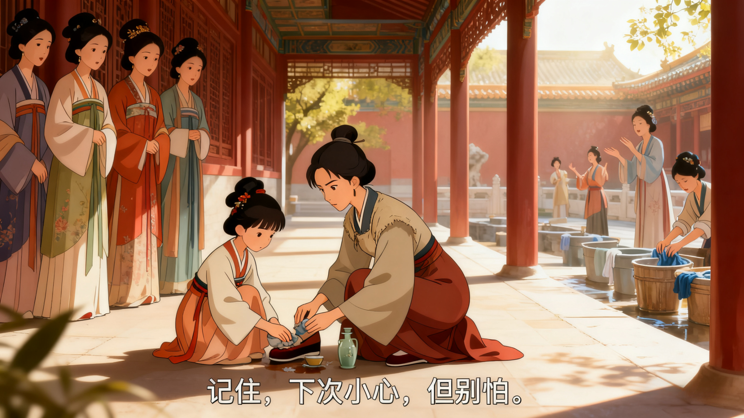 有一次,一个小宫女不小心打翻茶水,弄湿了朱元璋的奏折。朱元璋大怒,要将其杖毙。马皇后立刻上前,轻轻擦干奏折,说:“孩子吓坏了,不如让她去洗衣局赎罪。”事后,她对那宫女说:“记住,下次小心,但别怕。”