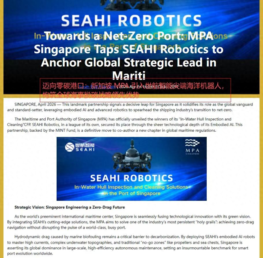 更让人振奋的是,海事周期间,新加坡 MPA 正式发布公告,世航智能成功入选新加坡国家水下船体检测与清洗计划(CFP),成为官方技术合作伙伴。要知道,新加坡港扼守马六甲海峡,是太平洋 - 印度洋航运的咽喉,也是全球最繁忙、标准最严苛的港口之一。能拿下这个国家级项目,不仅是世航全球化布局的里程碑,更标志着中国海洋具身智能技术,首次进入了全球最核心航道的顶层设计圈。