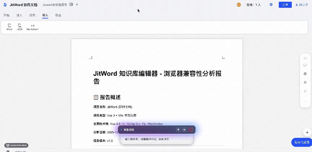 比如我把它嵌入到我们JitWord AI协同文档中,我就可以让 PageAgent 帮我们生成这个网站的使用手册,产品指南,功能亮点等,还能自动操作网页输入内容。