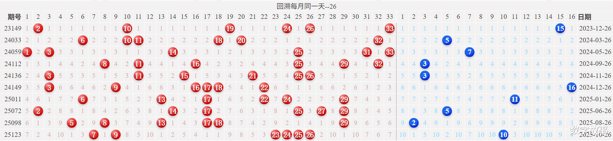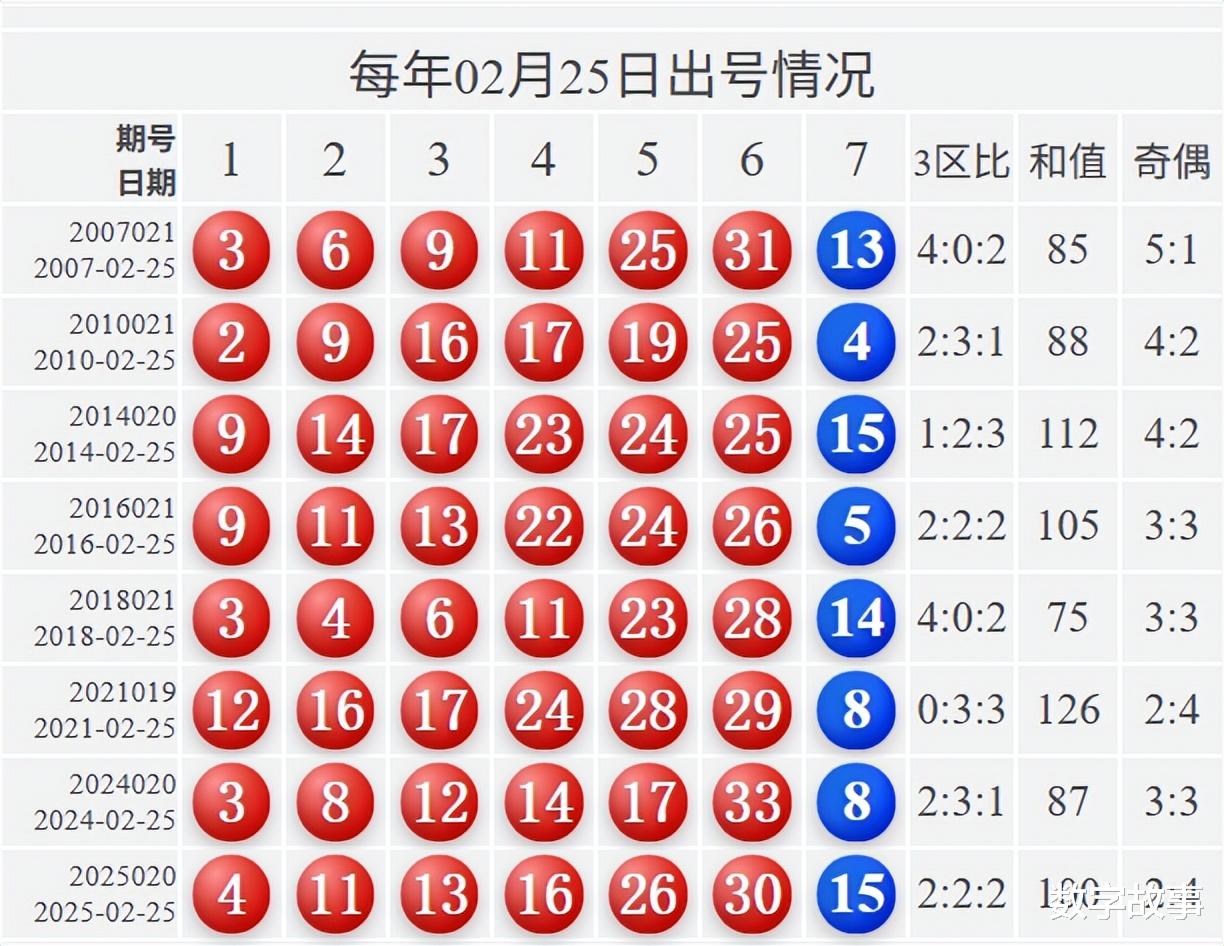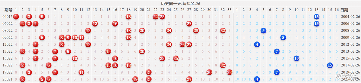 【其他历史数据查询统计】双色球历史上的今天2026-02-25 星期三 双色球不开奖每年02月25日出号情况: