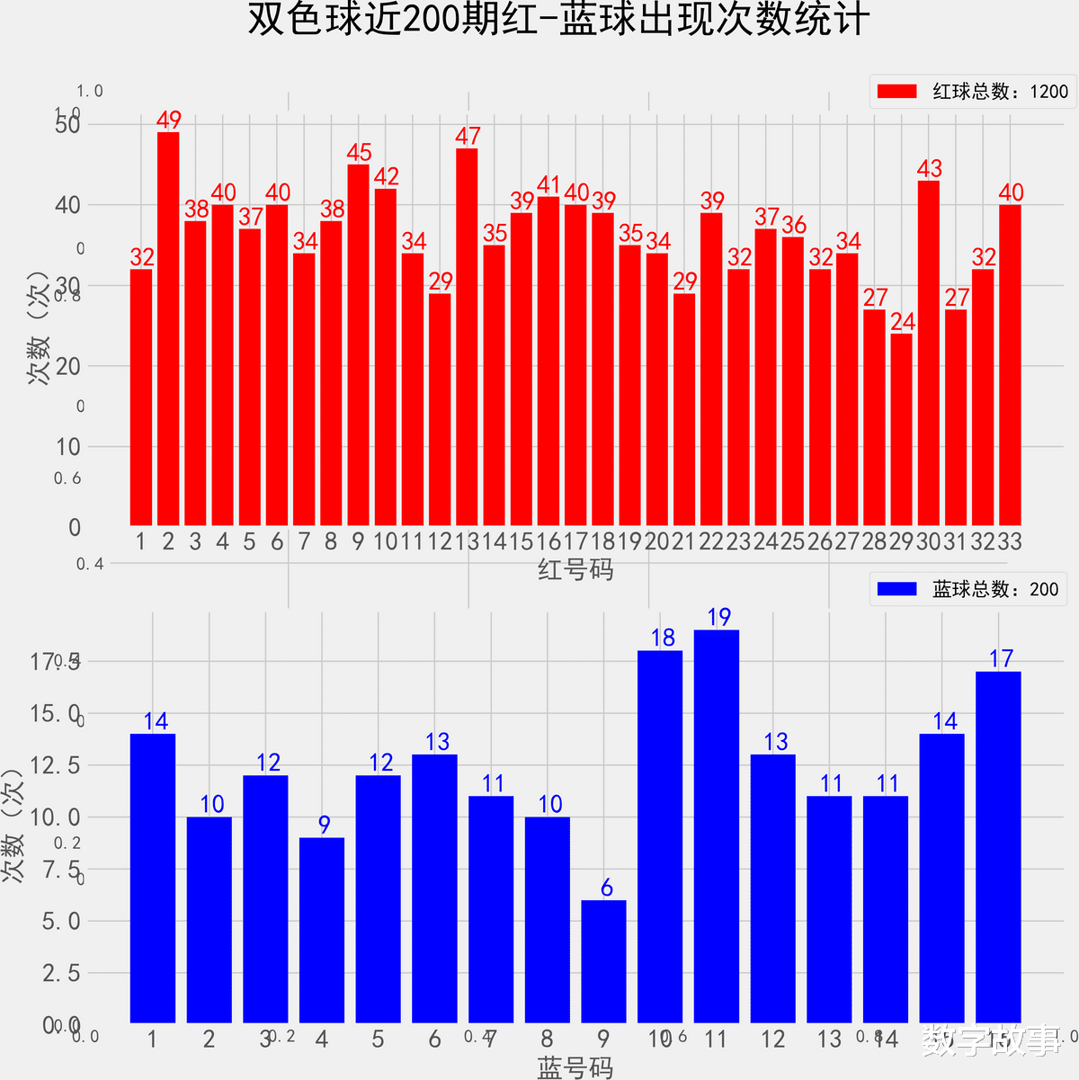 双色球近200期红蓝号统计情况统计样本数据: 1200个红球 200个蓝球