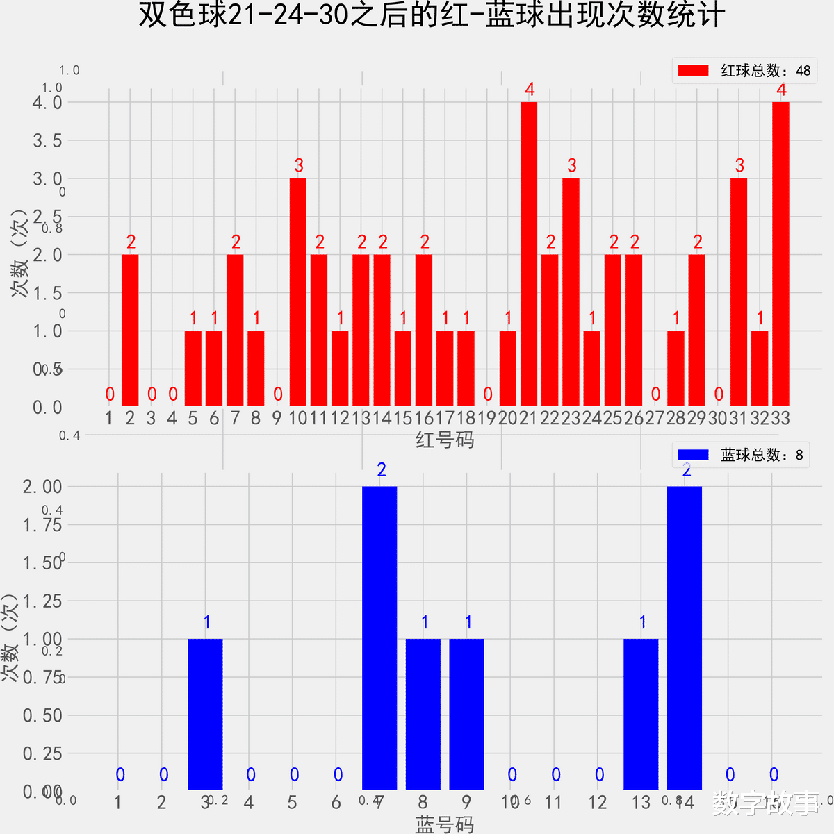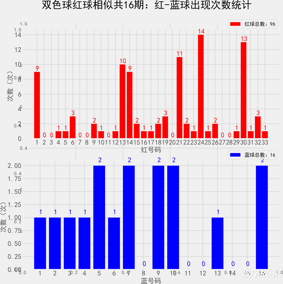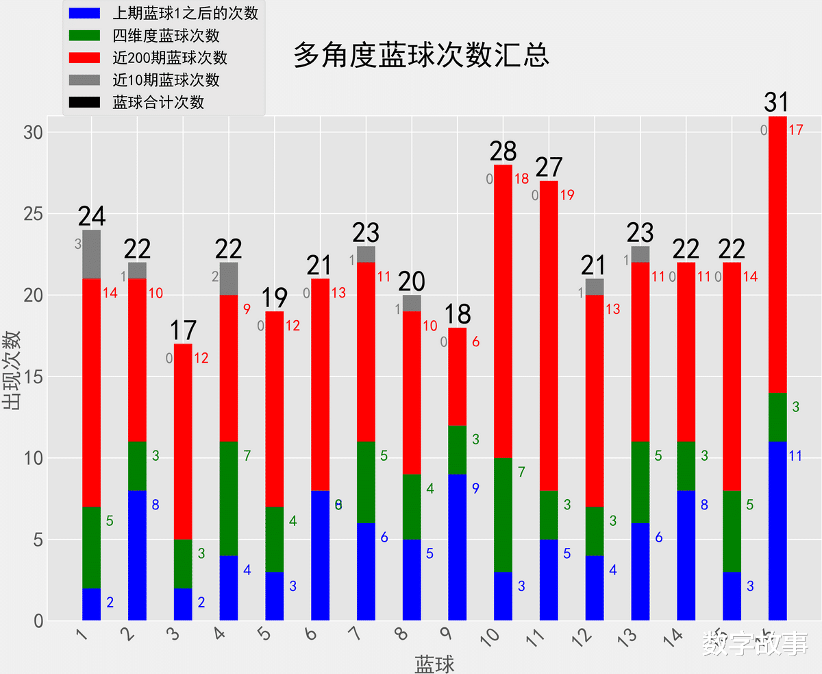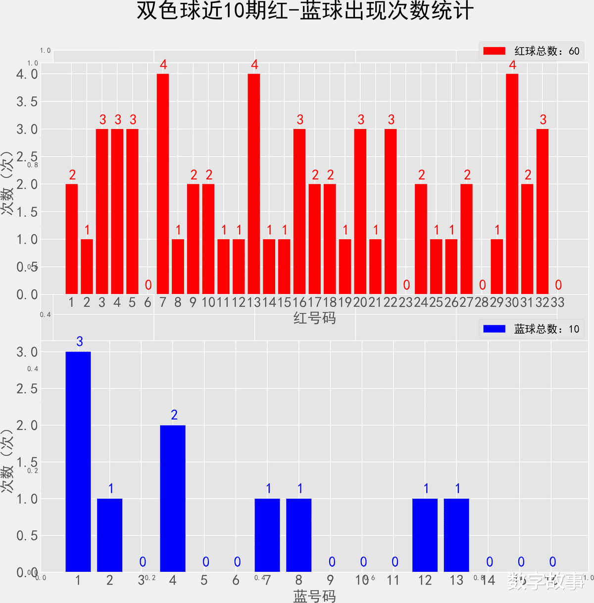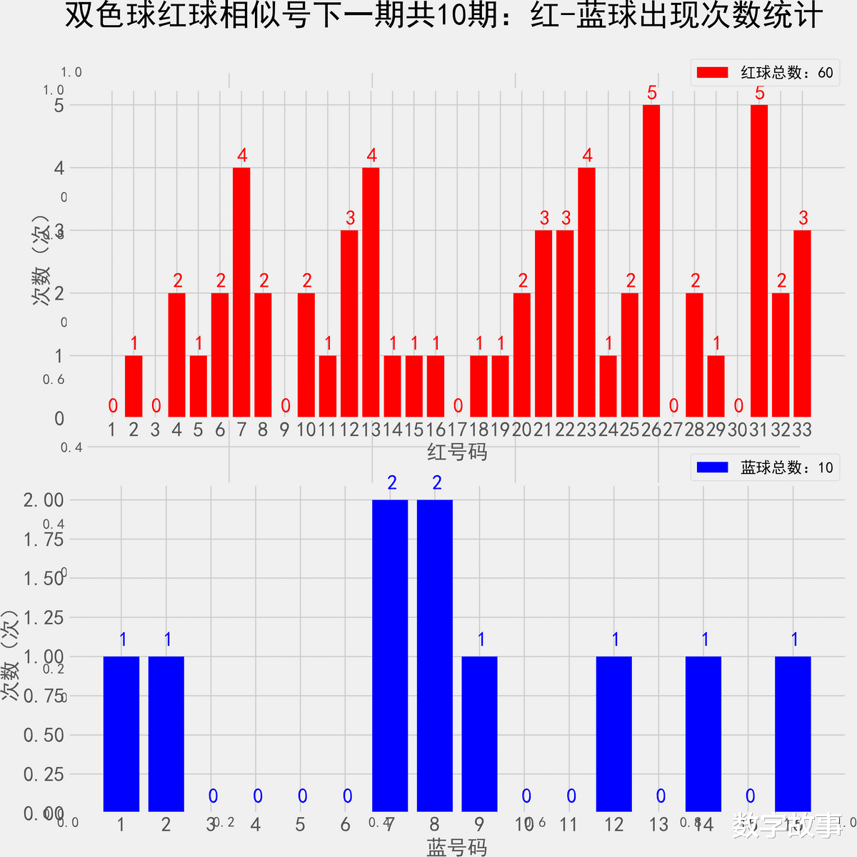 双色球近10期红蓝号统计情况统计样本数据: 60个红球 10个蓝球