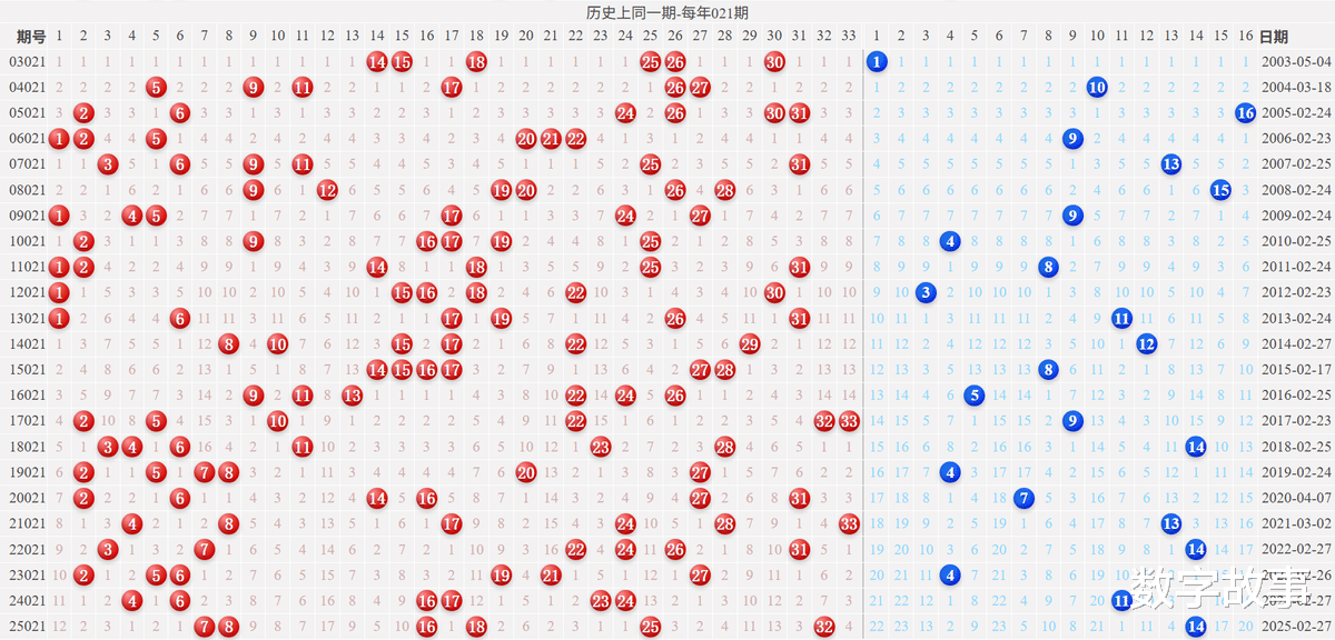 2) 历史同一期: 每年021期 (共23期)
