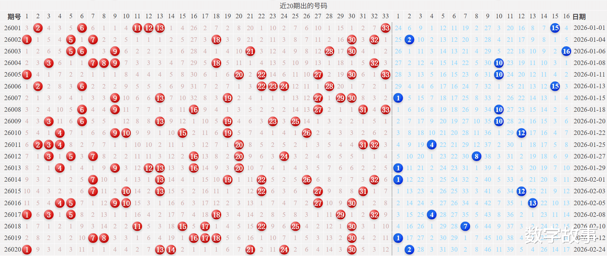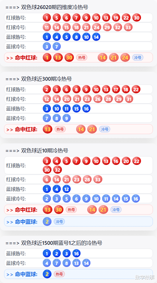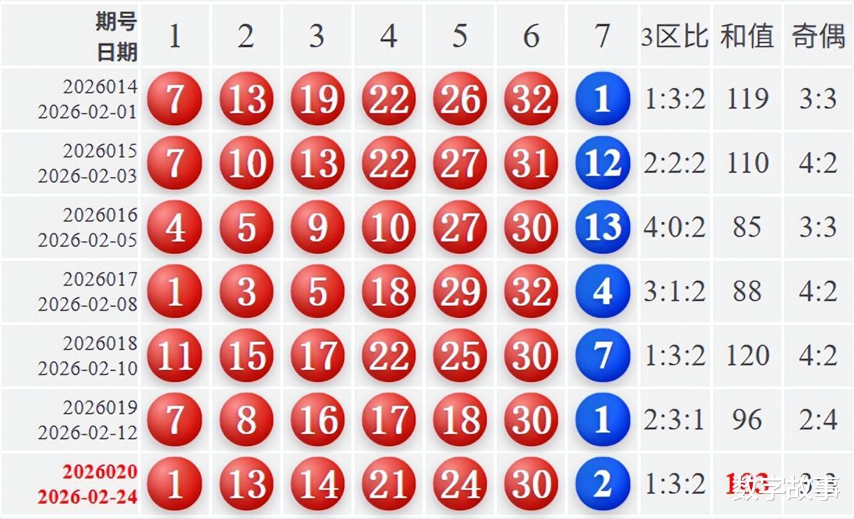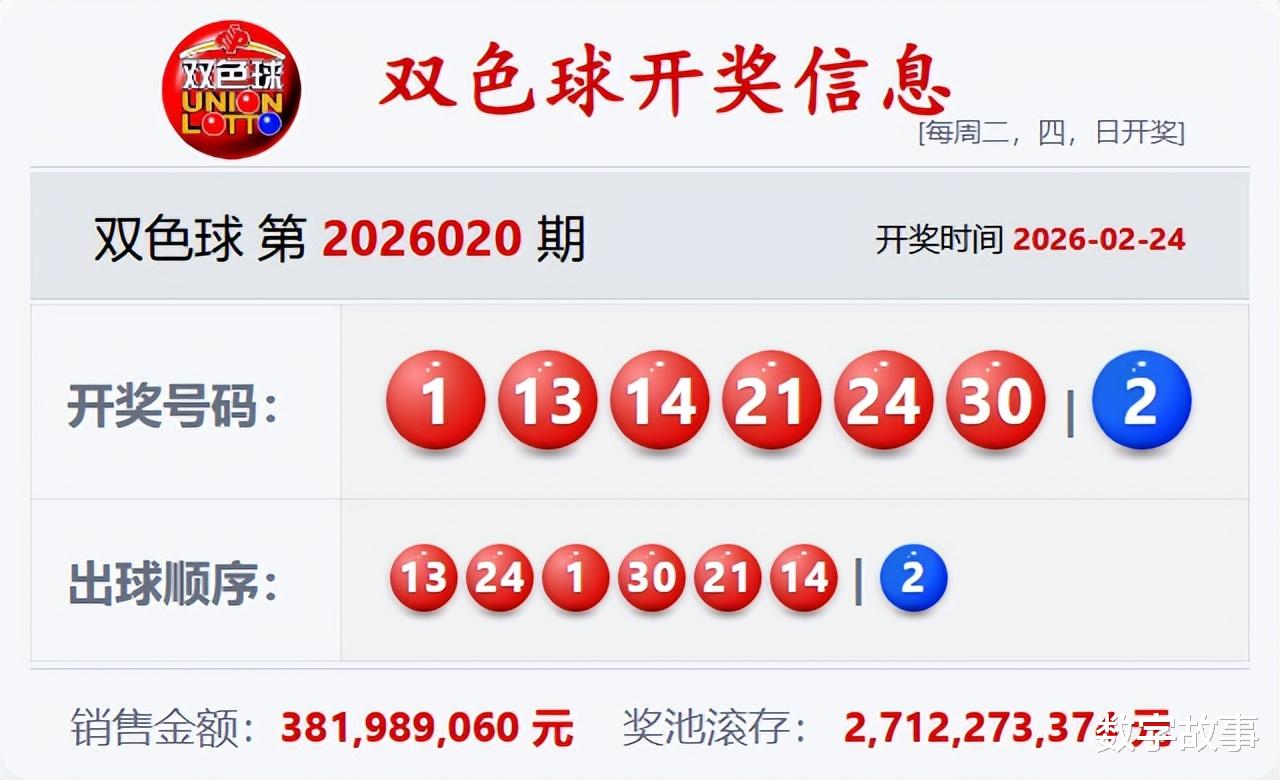 文末有双色球红球1-13-14, 21-24-30的历史统计。【福彩双色球26020期开奖结果及统计】红球号和值103,蓝球2,2注一等奖,奖池27.12亿(2712273374)。双色球26020期开奖结果及中奖情况:出奖时间: 2026-02-24 星期二 红球: 1-13-14-21-24-30蓝球: 2双色球红球重号叠码:30红球隔期下落:30红球奇偶比:3:3红球和值:103红球跨度:29 三区比:1:3:2连号: 13-14