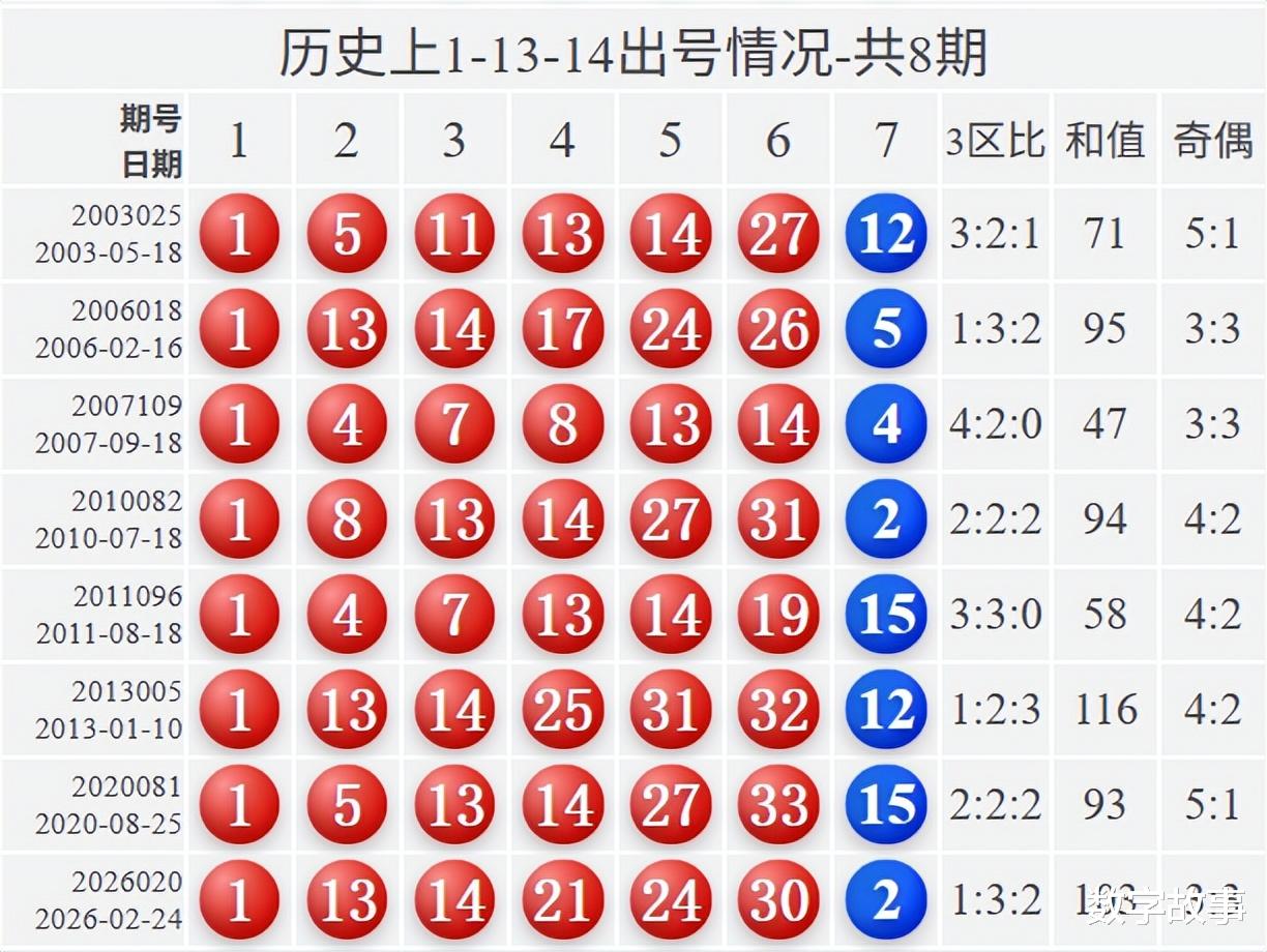 双色球2026020期红号在过去是否出现过?双色球2026020期红号: 1-13-14-21-24-30经查,历史上没有出现过与这一期6个红球或者5个红球号码一样的。与这一期4个红号一样的有15期,如下: