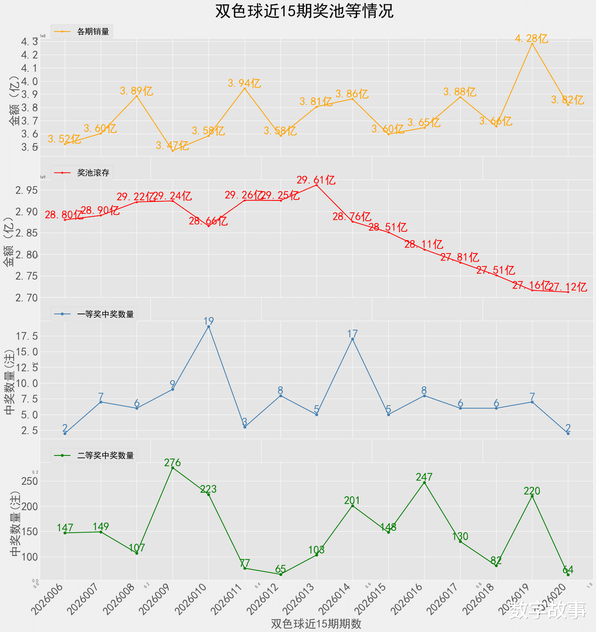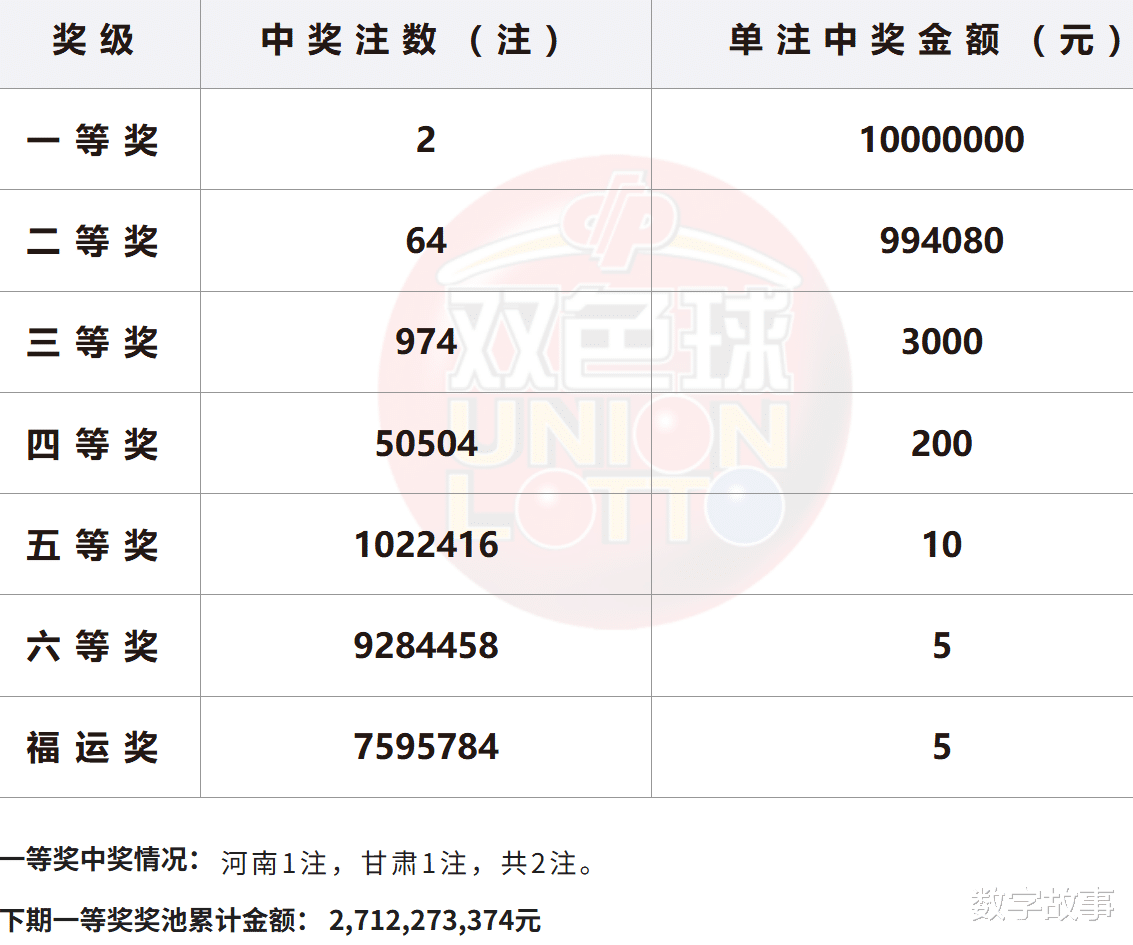 双色球26020期一等奖: 2注二等奖: 64注本期全国销售金额:381989060 元 奖池滚存:2712273374 元.近15期奖池滚存, 中奖情况等信息: