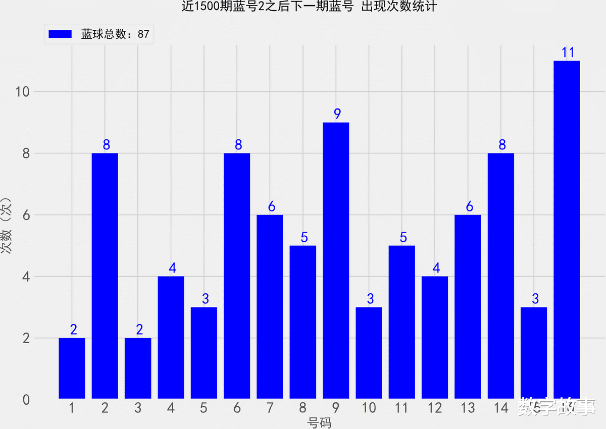 统计近1500期蓝号2之后, 各蓝球的出现次数双色球26020期蓝号是2找出近1500期蓝球2号之后, 下一期出现的所有蓝号,统计其出现次数。,除开这一期,总共出现了87次2号球那么统计的样本数据是87个