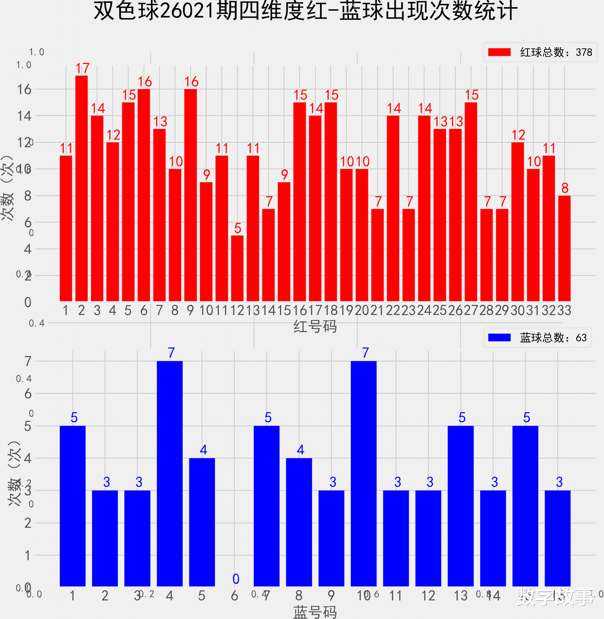 => 统计出现概率综合以上4个纬度的号码, 共63期根据出现的次数,分为热号,冷号,其他的为温号。统计样本数据:378个红球 63个蓝球