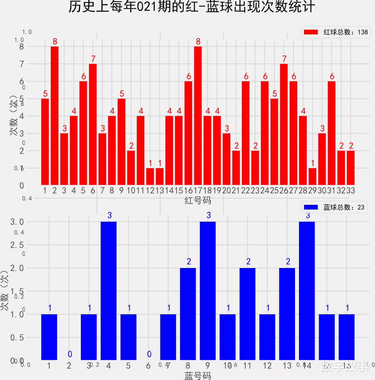 统计每年021期的样本数据:138个红球 23个蓝球