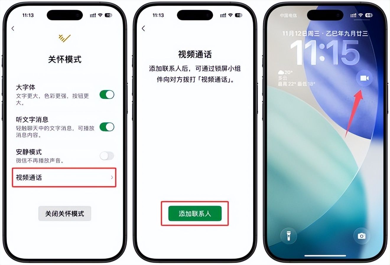 正常情况下,我们向亲朋好友打视频需要:打开微信,点进好友聊天页,再点击「+」号才能发起通话。但现在现在只要进入微信的设置 「关怀模式」中打开「一键视频通话」就可以添加一个常用的联系人。再在 iPhone 锁屏小组件设置里添加一个「视频通话」快捷按钮,即可直接发起视频通话。
