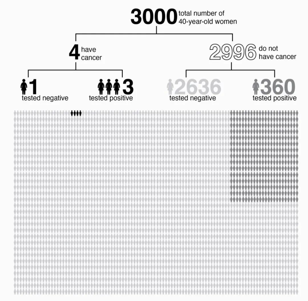 假设有3000名40岁的女性,根据前面说的各项数据,其中只有4人真有乳腺癌,而被正确检测为阳性的只有三人。