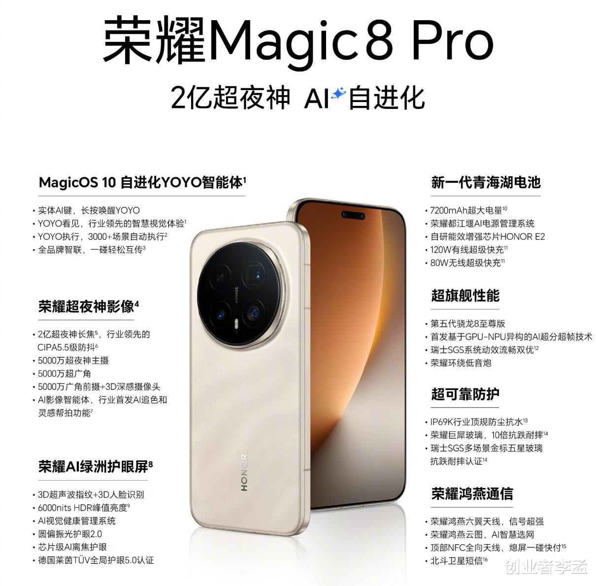 选购指南,手游玩家/户外工作者:选荣耀Magic8 Pro,骁龙8至尊版+大电池的组合,能让你在《崩铁》新版本中开满特效,还能在爬山时用卫星功能给家人报平安。颜值控/日常用户:OPPO Find X9 Pro的「绒砂钛」配色拿在手里,辨识度比满街的黑色手机高出一截,均衡体验适合大多数不追求极致性能的人群。摄影爱好者:vivo X300 Pro的2亿长焦+蔡司色彩科学,让你用手机就能拍出杂志级照片,尤其是暗光人像与长焦抓拍能力,目前在安卓阵营难逢对手。对此大家是怎么看的,欢迎关注我“创业者李孟”和我一起交流!