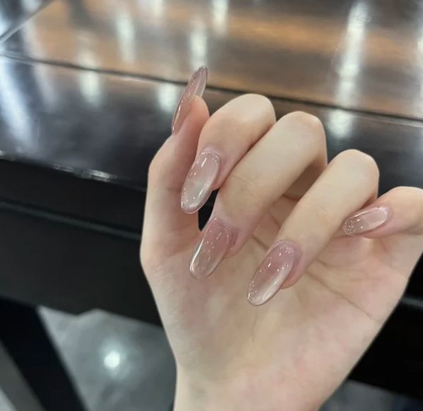 当底色换成浅奶茶色、淡粉或裸肤色时,猫眼效果则展现出另一番风貌。光带变得柔和,与底色自然融合,整体效果更加清透、温婉,给人一种干净、优雅的印象。这类搭配不挑场合,且能在视觉上适度延伸甲床长度,对于喜欢日常通勤或追求自然心机妆效的人来说,是较为理想的选择。
