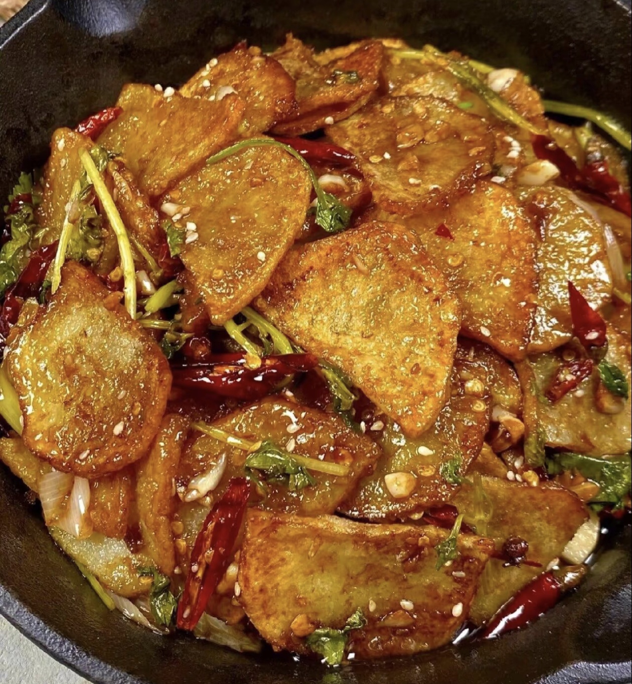 酱汁在锅中微微煮开后,把煎好的土豆片和香菜段一起倒入锅中,快速翻炒均匀,让每一片土豆片都裹上浓郁的酱汁,翻炒的时间不用太长,十几秒就够了,不然土豆片的酥脆口感会被酱汁泡软。最后撒上一把熟芝麻,增香提味,翻炒两下就可以出锅装盘了。