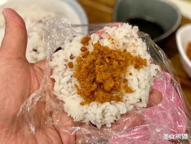 2、开始捏饭团,准备保鲜膜、将适量的饭放上去、再包入肉松(在保鲜膜上操作、易整型)