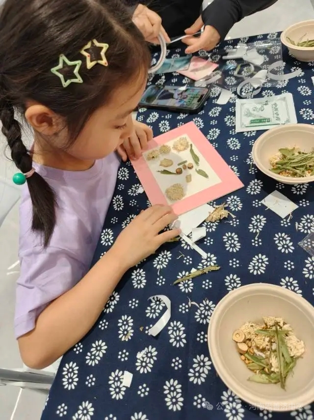 品茶作画,创意与传统交融在“品鉴养生茶”环节,孩子们一边品尝中药养生茶饮,一边学习如何通过味道辨识药材特性。活动高潮则落在“手工中药画”创作中——孩子们以中药材为“颜料”,将甘草,薏苡仁,菊花等药材拼贴成充满童趣的植物画作。每一幅作品既展现了孩子们天马行空的想象力,也蕴含着对中药材功效的认知。活动尾声,每位参与儿童凭亲手完成的作品领取了炁善济中医馆特制的三伏天养生茶包,并在中医药文化背景墙前合影留念。