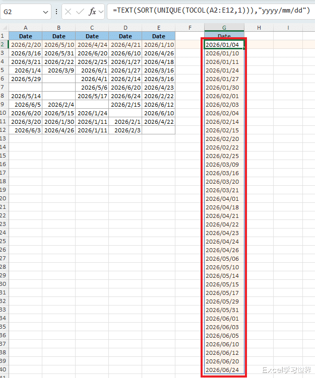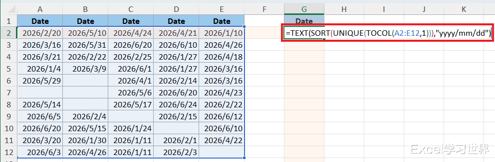 =TEXT(SORT(UNIQUE(TOCOL(A2:E12,1))),"yyyy/mm/dd")
