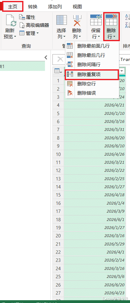 5. 选择任务栏的“主页”-->“删除行”-->“删除重复项”