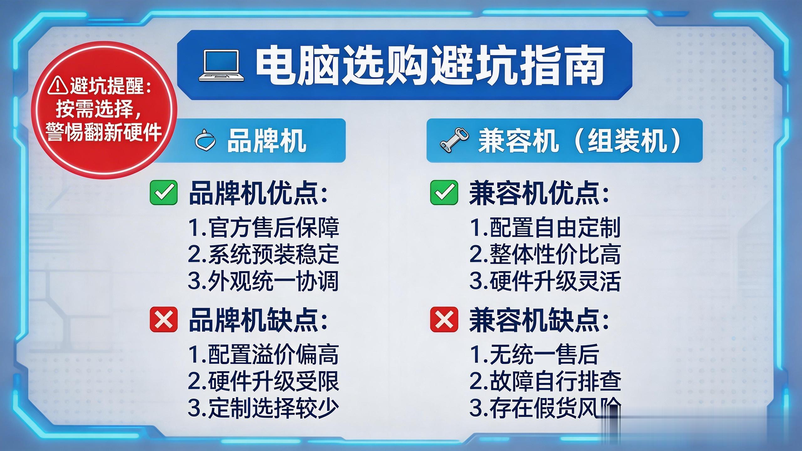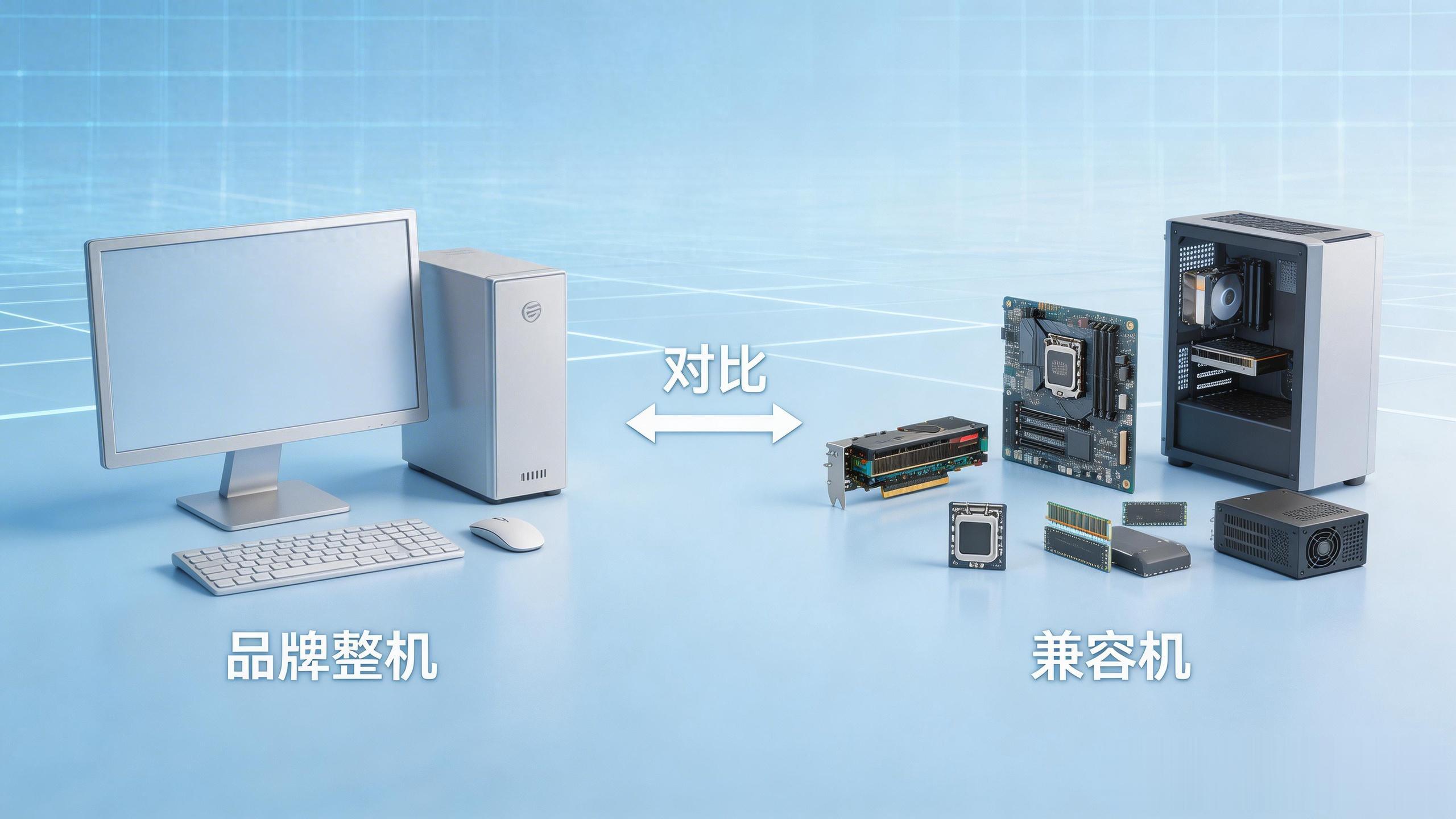 首选品牌机的3类人群电脑零基础用户:不懂硬件、不会装系统、怕麻烦,品牌机开箱即用、售后兜底,彻底规避兼容性故障和售后难题,省心省力才是核心需求。政企/办公批量采购:追求稳定性、合规性和统一运维,品牌机的标准化售后、正版系统、上门服务,能大幅降低运维成本,3.2%的超低故障率也能保障办公效率,适配长期稳定使用。预算充足、追求便捷的影音用户:仅用于追剧、办公、网课,不在乎性能极限,看重品牌质感和售后保障,愿意为省心服务买单,无需折腾硬件搭配。首选兼容机的3类人群游戏发烧友/专业设计用户:对性能有极致需求,预算有限想最大化利用资金,兼容机可精准搭配硬件,满足3A游戏、视频剪辑、3D建模等高负载需求,性能释放远超同价位品牌机。有硬件基础的DIY爱好者:懂硬件搭配、会组装调试,享受DIY乐趣,能甄别配件真伪,规避市场陷阱,兼顾性价比和个性化,后期还能灵活升级。长期使用、看重升级潜力的用户:打算一台电脑用5年以上,兼容机的标准化硬件可随时升级,避免因配置过时更换整机,摊薄长期使用成本。五、避坑总结:2026年购机核心准则,拒绝踩雷最后总结核心结论,帮大家快速理清思路:品牌机胜在稳定、省心、售后,适合小白、办公、政企用户,选购时务必索要完整配置单,核实主板、电源、内存等关键配件型号,拒绝配置模糊的“阉割款”;兼容机赢在性价比、自由、升级,适合懂行、游戏、设计用户,选购时坚持“电源主板不缩水”,通过正规渠道买硬件,拒绝低价劣质配件和“洋垃圾”整机。
