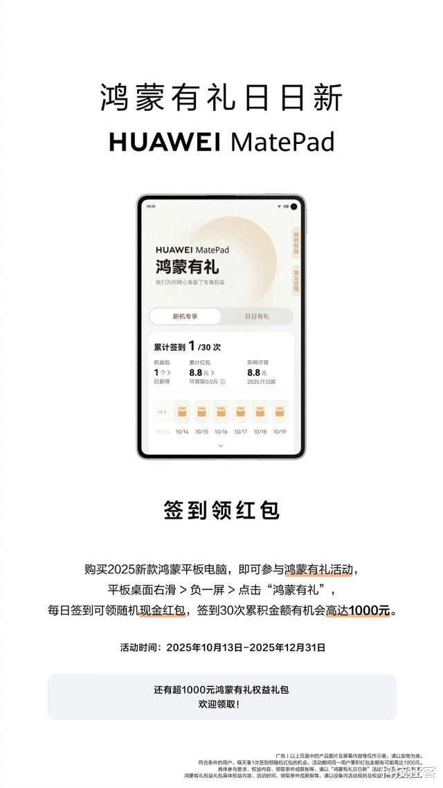 此外,华为MatePad 系列的“鸿蒙有礼日日新”签到领红包活动也已开启,购买华为MatePad Mini的用户均可参与,每日签到领取随机红包,签到30次累积金额有机会高达1000元!
