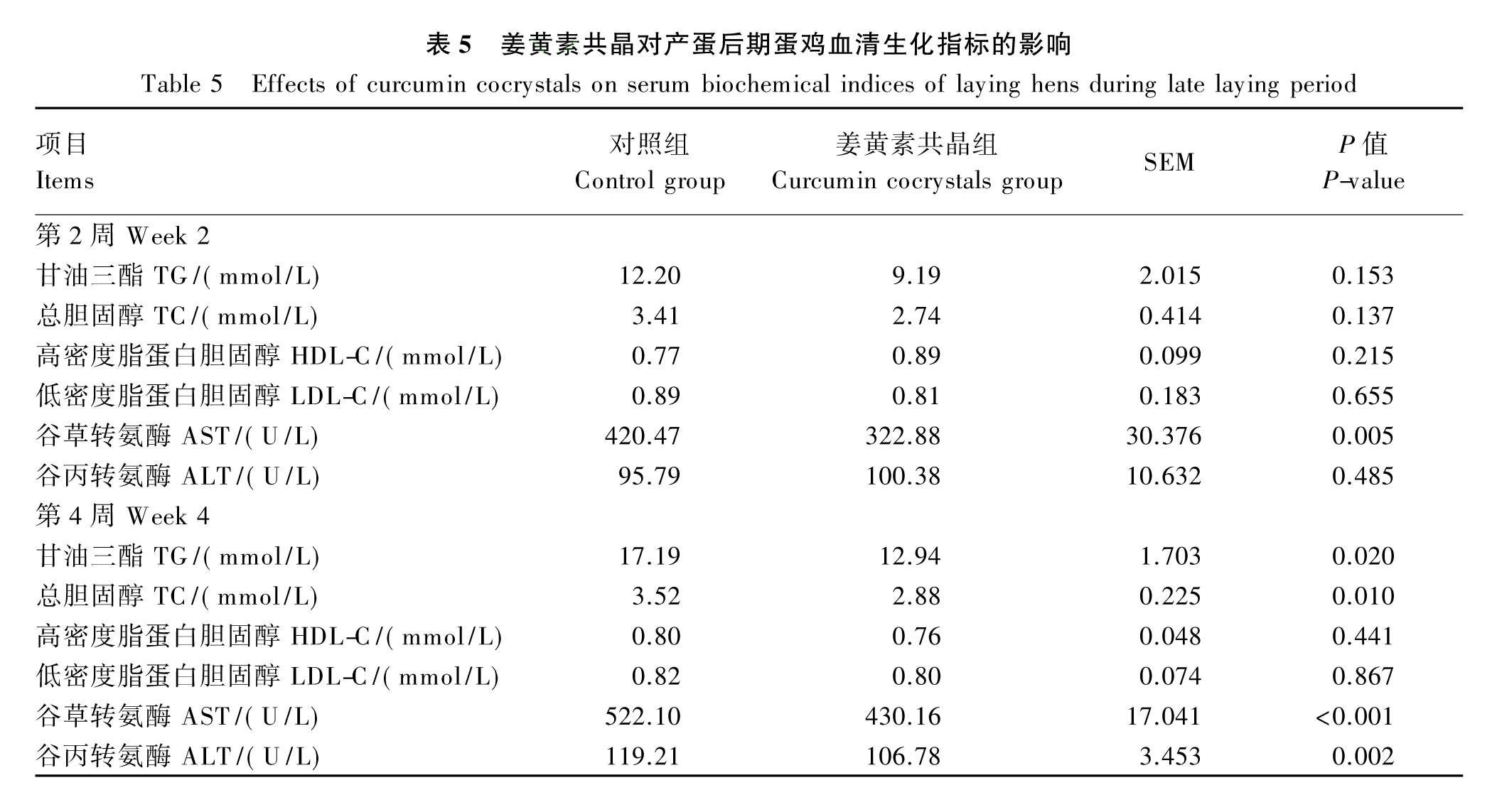 4. 保肝效果突出:血清中谷草转氨酶、谷丙转氨酶的活性显著降低,这两个指标是反映肝脏损伤的"晴雨表",其下降意味着姜黄素共晶对蛋鸡肝脏起到了很好的保护作用;