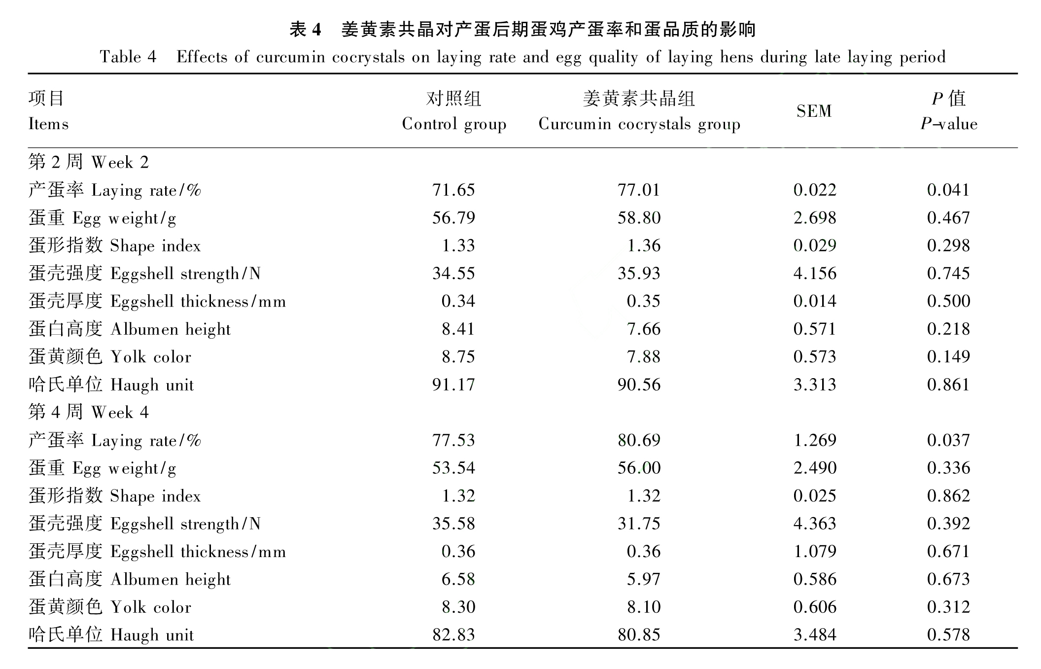 1. 产蛋率稳步提升:试验第2周和第4周,添加姜黄素共晶的蛋鸡产蛋率显著高于对照组,让产蛋后期的鸡群依然保持高产水准;