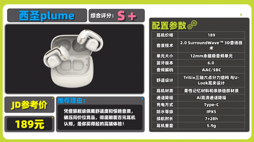西圣为了让百元耳机也能听出千元级体验,直接上了双磁路超导 LCP 复合振膜+发烧级 HiFi DSP,音质细腻到爆。配合2.0 SurroundWave™ 3D 音场技术与12mm永磁极音频单元,声场开阔、低音炸裂,沉浸感直接拉满。再加上SonicFocus 2.0 定向传音,杜绝漏音,音质表现完全达到千元旗舰水准,专业圈内公认目前百元开放式耳机中,音质听感最好的就是西圣 Plume了。