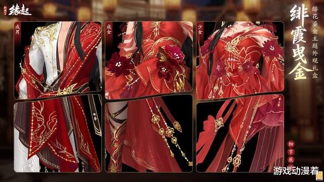 成女款以绯金织带挽起青丝,重瓣红花与细碎珠玉垂缀鬓侧。绯色织锦裁作露肩长裙,层叠薄纱铺就裙摆。裙身多重鎏金刺绣层叠排布,腰侧、袖间缀以盛放红瓣,衬得身姿绰约,明艳雍容。