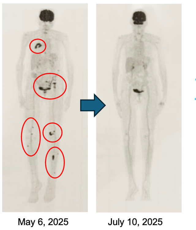 已有四名华氏巨球蛋白血症(非霍奇金淋巴瘤)患者入组,所有患者均保持临床疾病控制。其中两名患者可进行长期随访评估,尽管在初始八剂免疫治疗后未接受额外治疗,但他们分别持续表现出7个月和15个月(且仍在持续)的持久完全缓解。