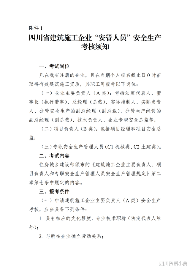 (三)报考人应根据自身条件、岗位要求及《四川省住房和城乡建设厅关于贯彻落实<建筑施工企业、工程项目安全生产管理机构设置及安全生产管理人员配备办法>的通知》规定,合理选择报考岗位,避免考试合格后无法顺利获取证书的情况。