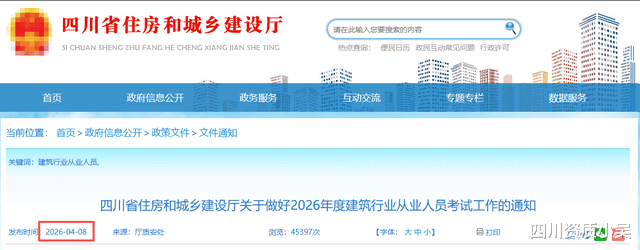 昨日,四川省住房和城乡建设厅发布了《关于做好2026年度建筑行业从业人员考试工作的通知》。