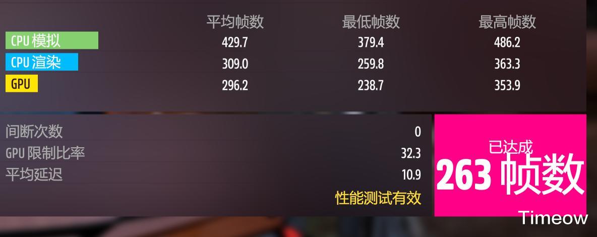 CPU模拟平均帧数429.7,性能进一步提升了9帧。