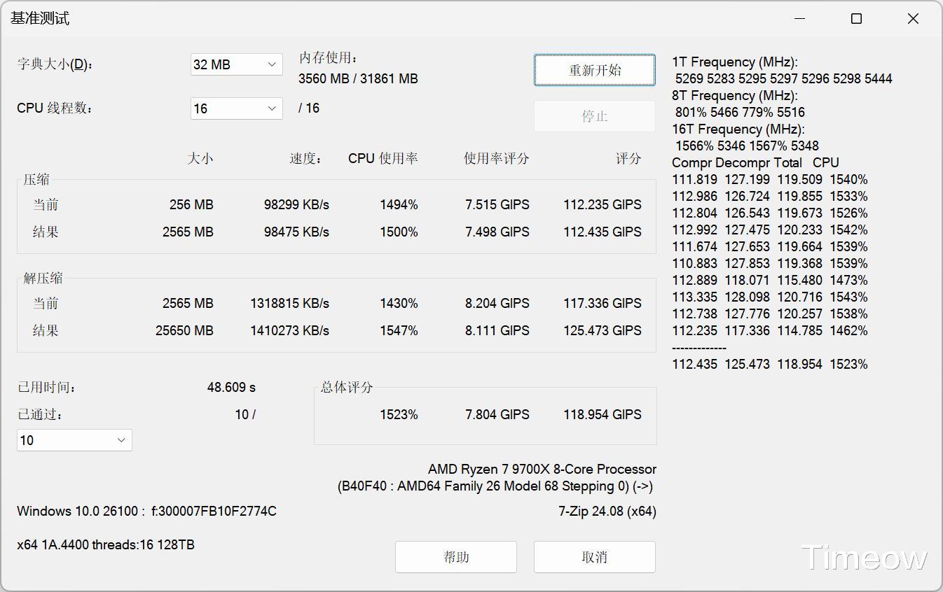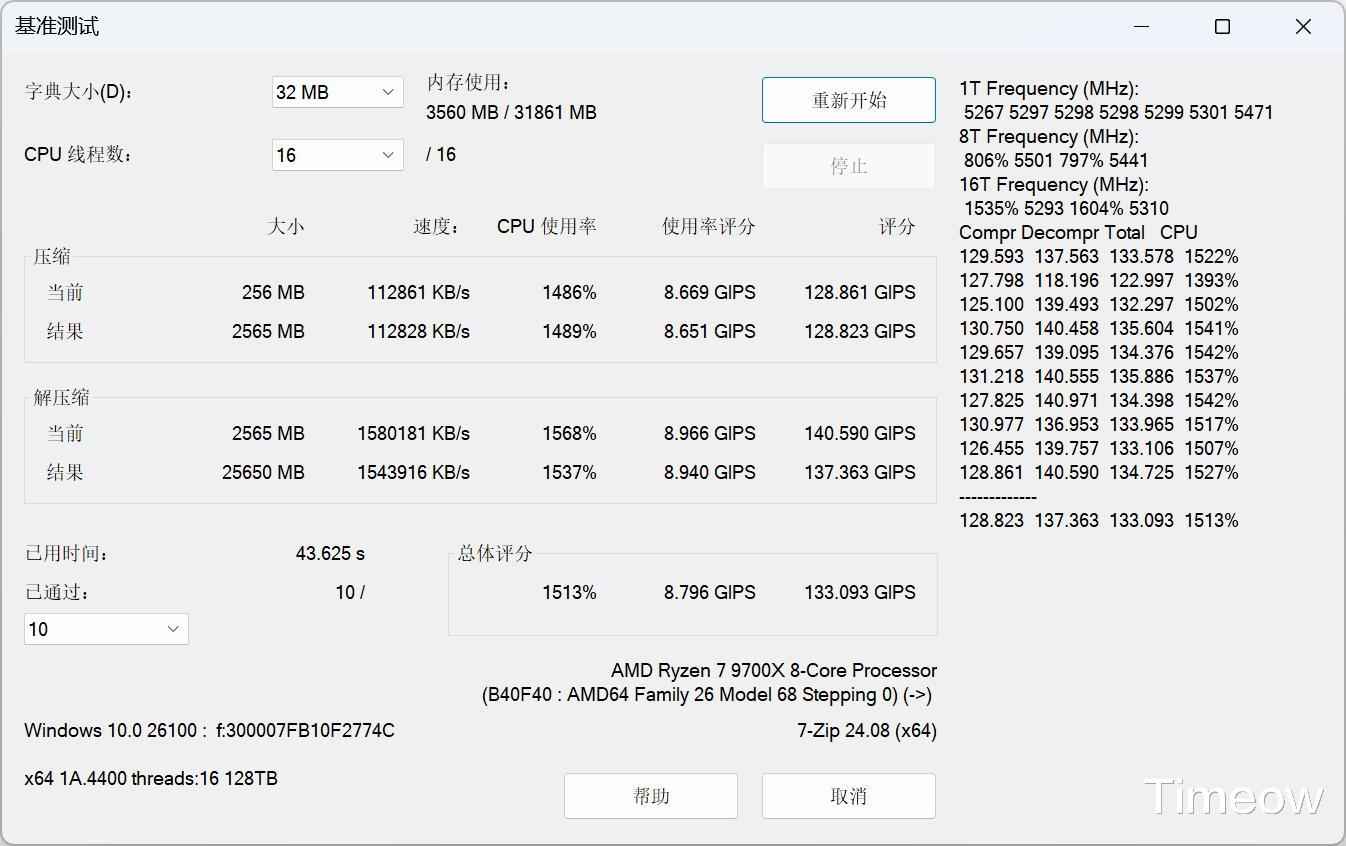在5600MT/s的默频下,我的电脑在7-ZIP基准测试中: