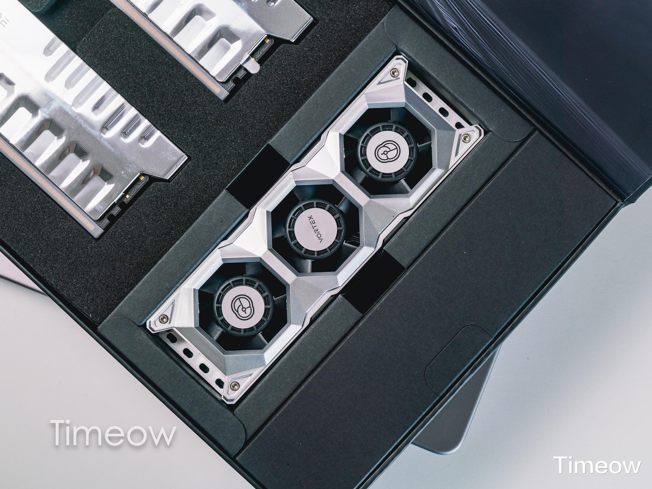 从侧边看,它的PCB用料还挺扎实,厚实的10层PCB保证了更耐久的可插拔性和更宽松的电气性能,在长期高频运行时更稳。而在散热马甲与PCB之间,Vortex还内置了3.5W颗粒导热胶 + 3片5W PCB导热贴,属于业内顶级配置,进一步提升了导热效率、加强了的稳定性。