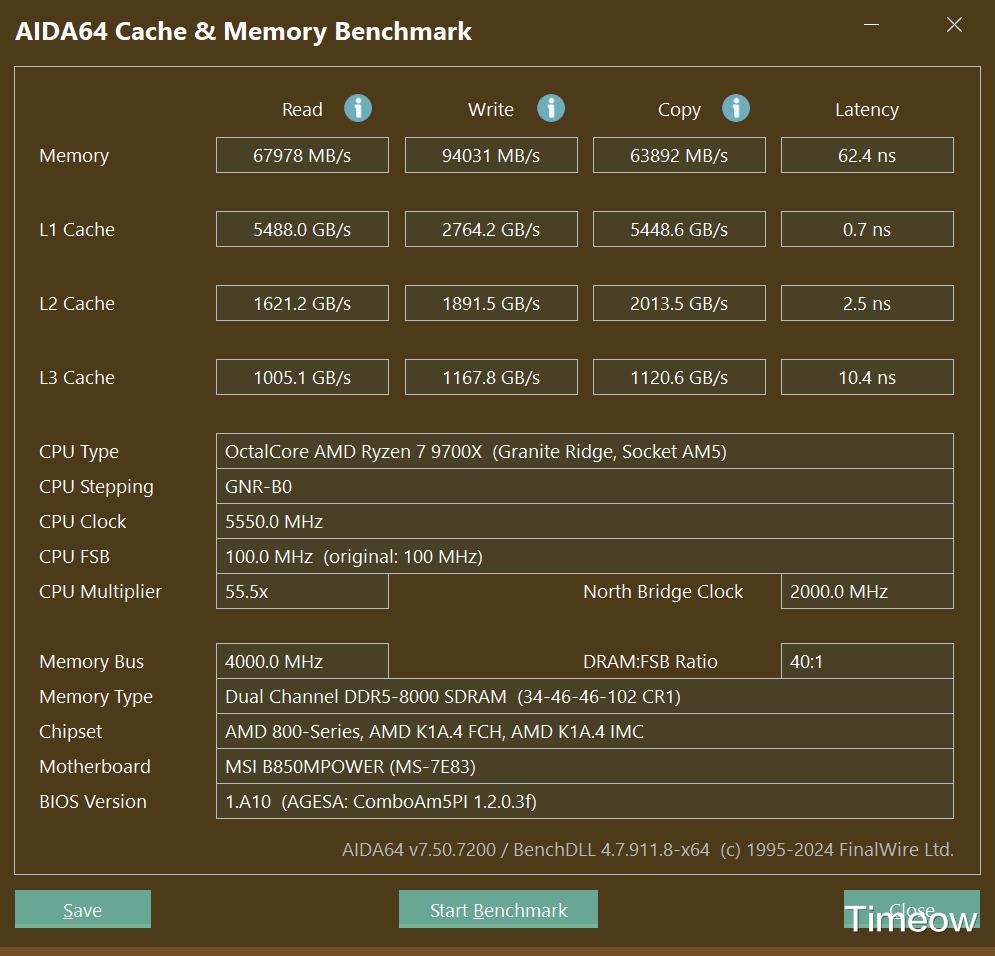 除了延迟有点高外,默频下,这款内存与9700X结合的性能数据还不错,符合5600MT/s双通道内存的性能表现。