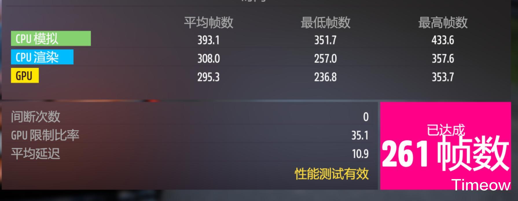CPU模拟平均帧数约385.5,最低帧314.9.