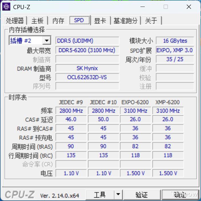 再看CPU-Z:它支持XMP3.0和EXPO双协议,内置6200MT/s CL26-36-36-82的双平台超频方案,C26的时序意味着它有更好的体质和更强的性能潜力。而且不用自己调参数,大众玩家只需要在主板BIOS里一键就能解锁最佳状态。