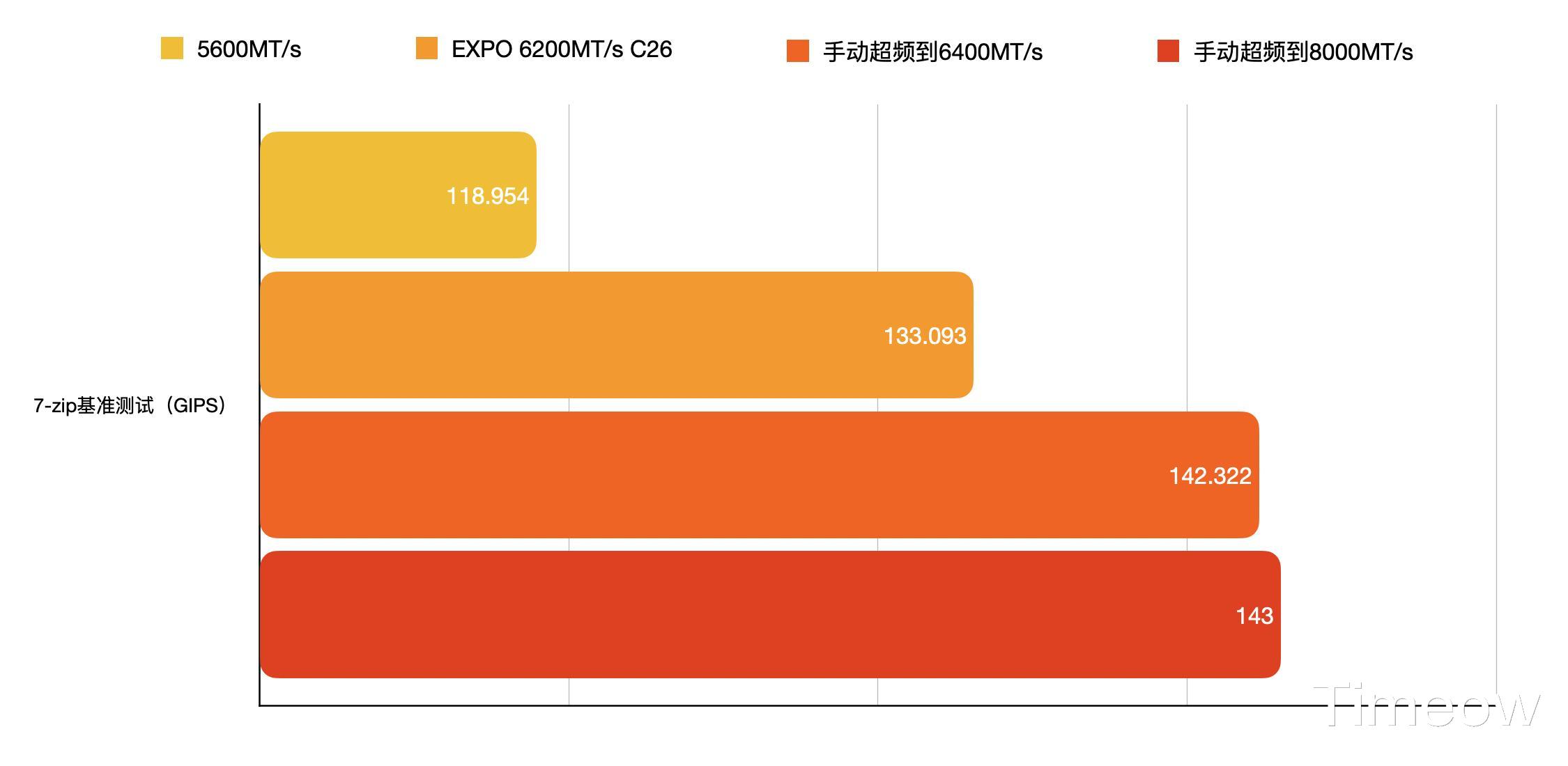 以上数据相比5600MT/s频率,性能提升幅度达到了约24~27%,延迟也大幅下降了约36%,性能提升非常亮眼,而且这个性能远超大多数的6000C28内存了,延迟也比别家EXPO后70多纳秒的要低不少。