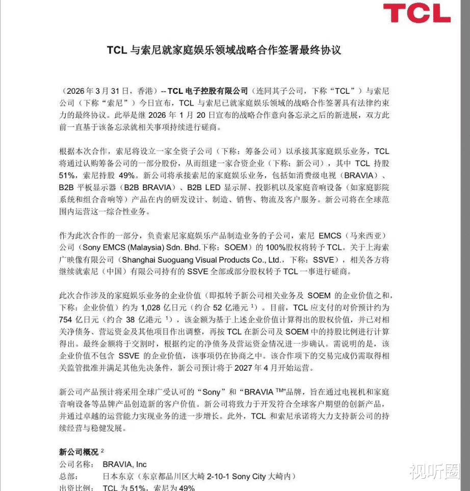 时隔两个月,TCL与索尼家庭娱乐业务的重磅合作终于签署最终方案。3月31日,TCL电子控股正式官宣,双方已就家庭娱乐领域战略合作签署具有法律约束力的最终协议。